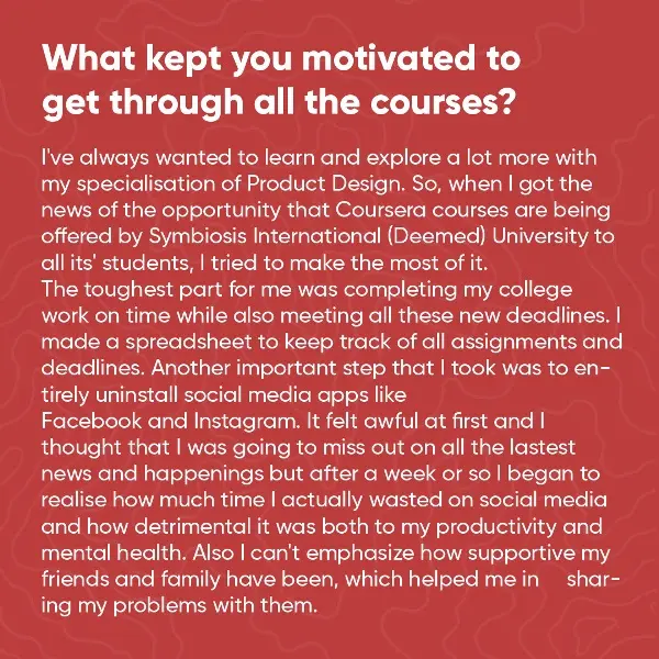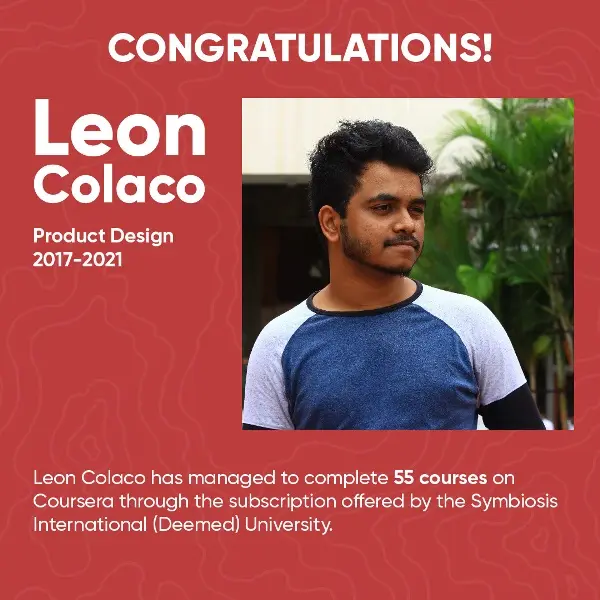 We wish to congratulate our 4th year Product Design student, Leon Colaco for completing 55 courses on Coursera. The subscription was offered to our students as an online learning opportunity by the Symbiosis International (Deemed) University. He completed these courses without compromising on his regular academic classes and assignments! Once again, Congratulations Leon for a spectacular achievement!