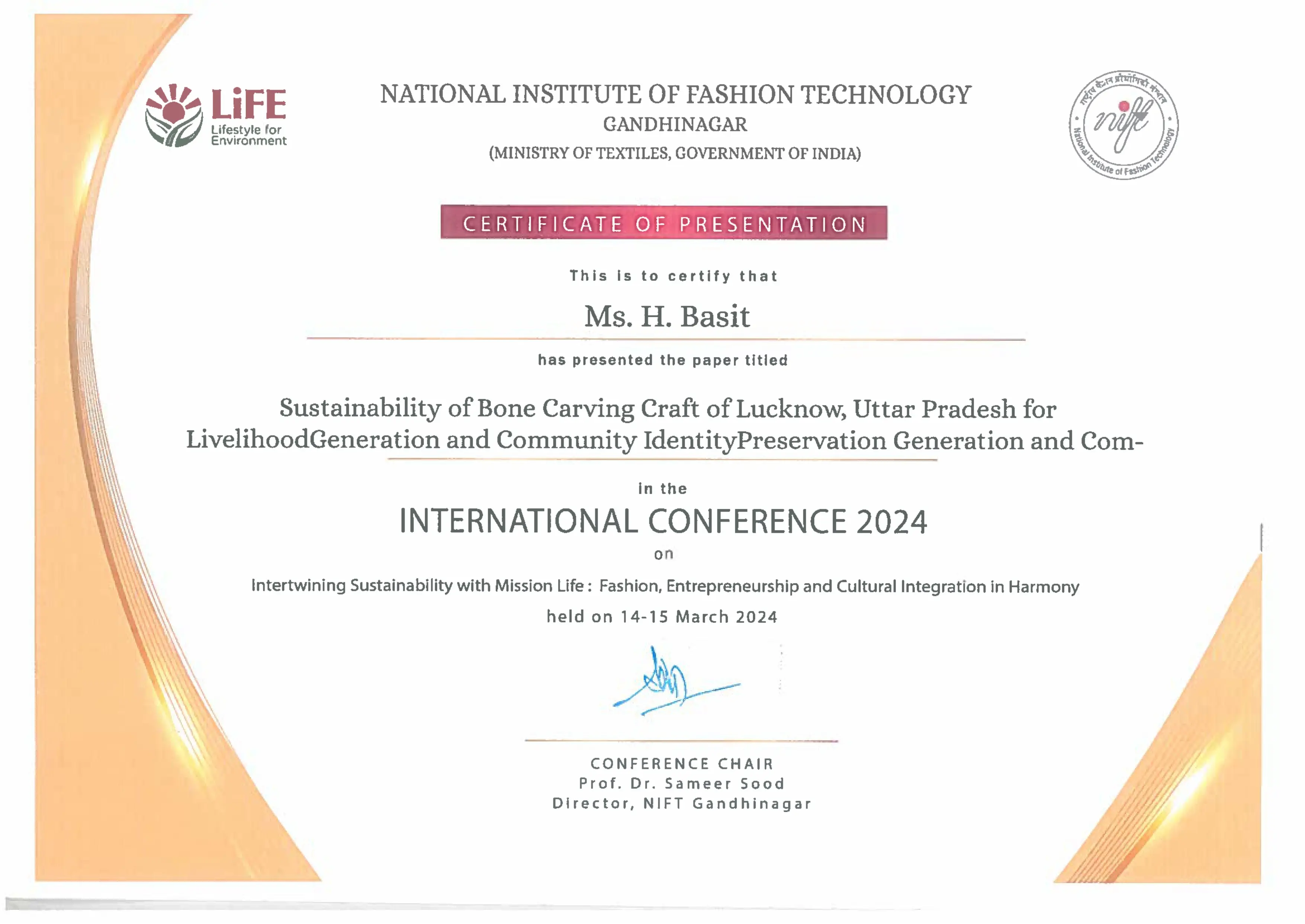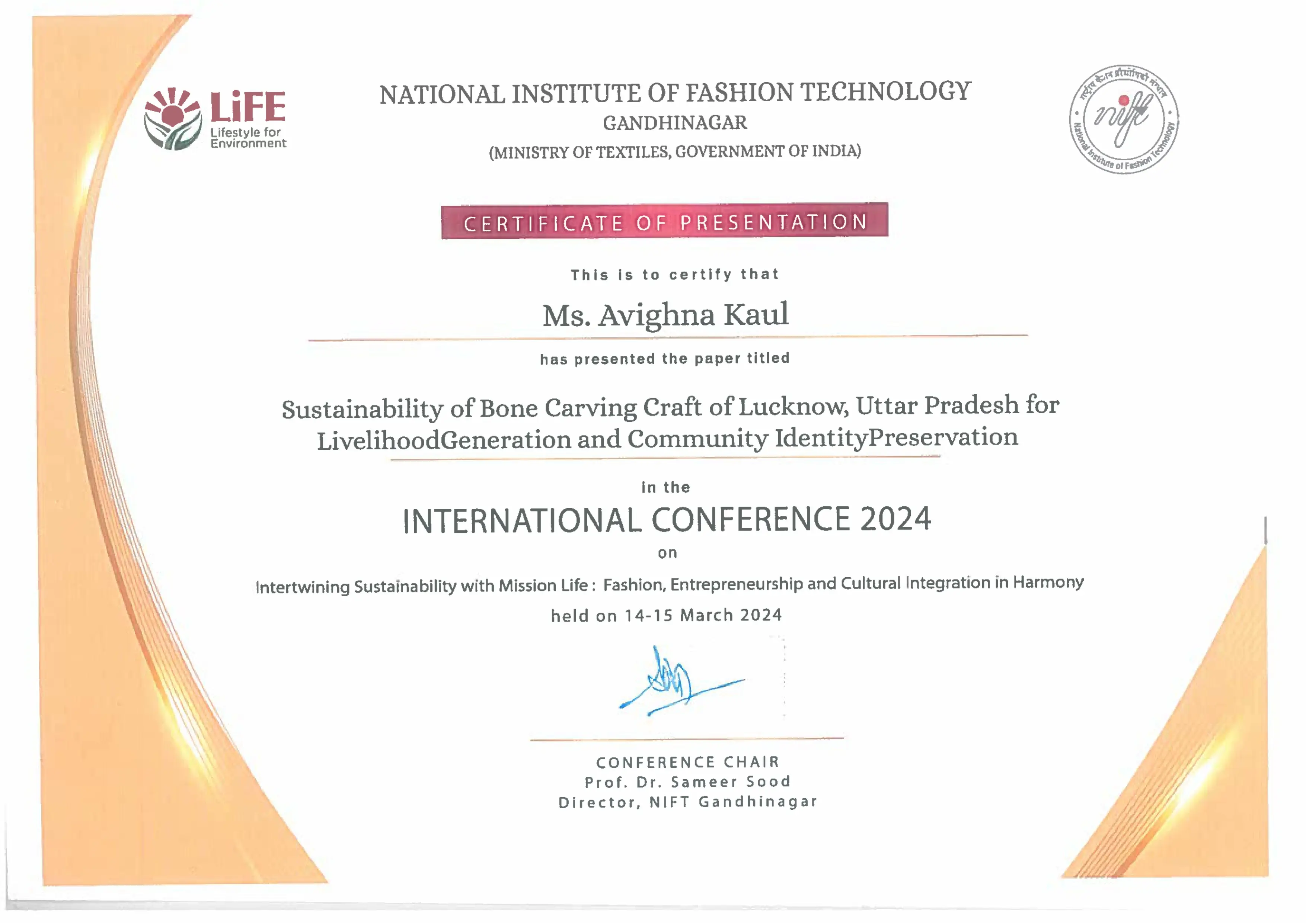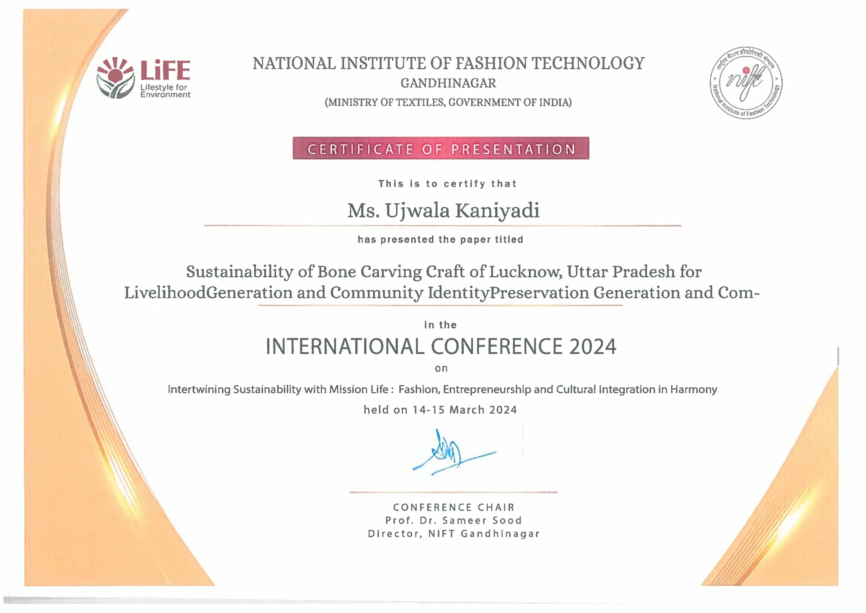 Students of 3rd year Fashion Design (Batch 2021-25) - Ujwala Kaniyadi, H Basit and Avighna Kaul presented their research paper on Bone Carving Craft of Lucknow, Uttar Pradesh at a conference at NIFT Gandhinagar