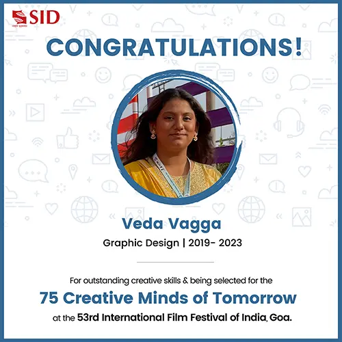 Congratulations Ms.Veda Vagga, 4th year Graphic Design student for receiving the 75th Creative Minds of Tomorrow award by the hands of Shri. Anurag Thakurji, Hon. Union Minister of Information and Broadcasting, Youth Affairs and Sports, Government of India in IFFI 2022 in Goa.