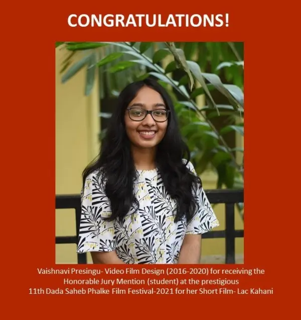 Heartiest Congratulations to Ms. Vaishnavi Presingu, our Video Film Design (2016-20) student, for receiving the Honorable Jury Mention (student) at the 11th Dada Saheb Phalke Film Festival-2021.
