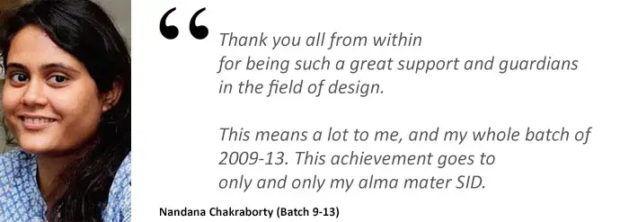 SID Alumni Nandana Chakraborty achieved a Bronze award in a competition (student category) held by the International Institute of Information Design, Vienna, Austria for her Final degree project (2009-13) "Teaching and Learning Aid for children with learning disabilities".