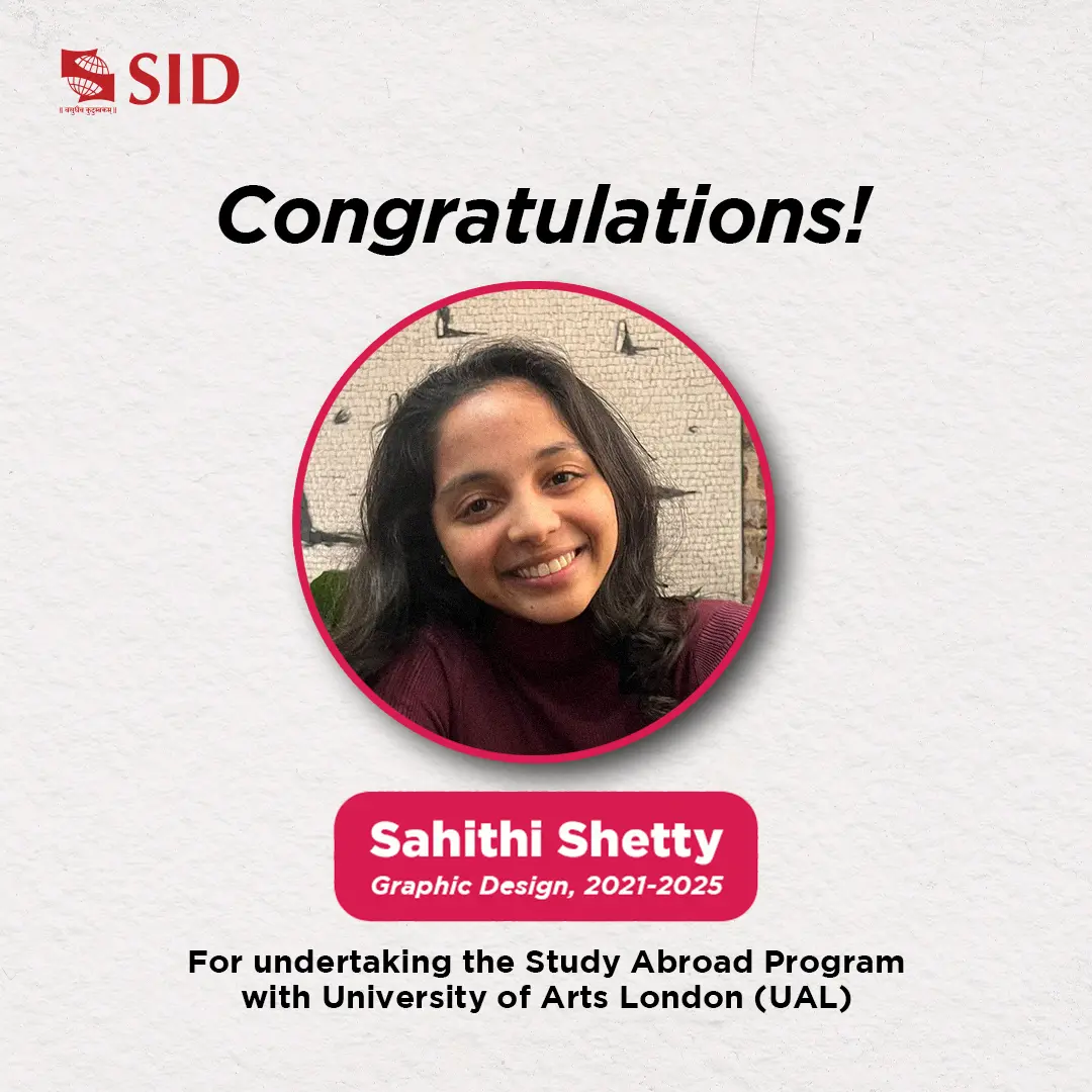Congratulations and Best Wishes to Sahithi Shetty, Graphic Design student (Batch 2021-25) for undertaking the Study Abroad Program with UAL London from February to June 2024! SID International Cell facilitates Student Exchange & Study Abroad programs for the students at SID, where students from 3rd & 4th year undertake one semester of study at the International partner Universities of SIU.