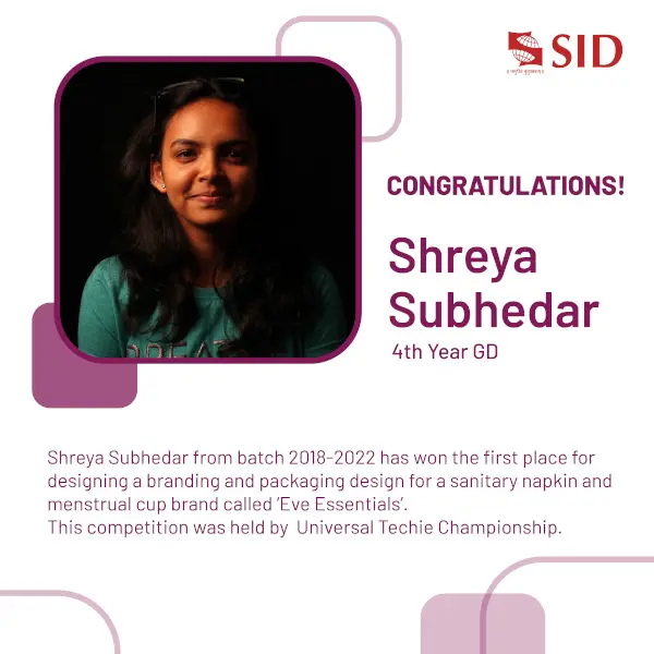 Congratulations to Ms. Shreya Subhedar for winning first place in the Design Competition held by Universal Techie Championship. Shreya is a 4th year Graphic Design student. She designed a branding & packaging design for a sanitary napkin & menstrual cup brand called "Eve Essentials".