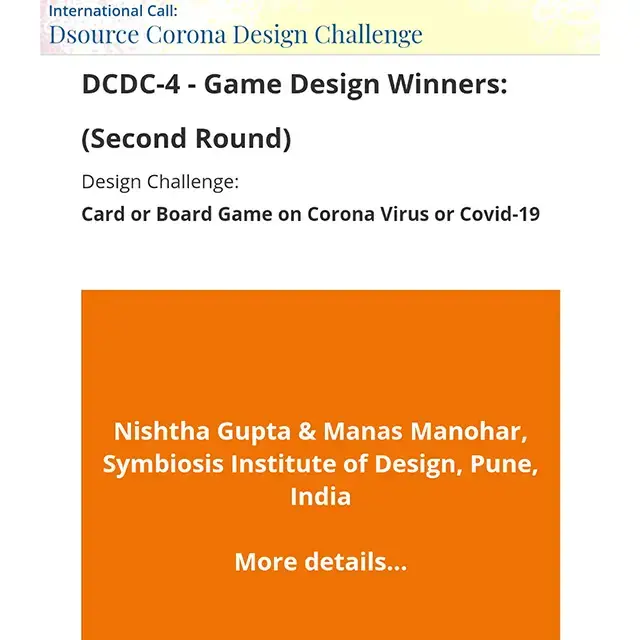 Our students leave no stone unturned to make us proud! Manas Manohar (UED 2017-21) & Nishtha Gupta (PD 2017-21) participated in Dsource Corona Design Challenge an initiative by IDC school of design-IIT-B in the Game design category.