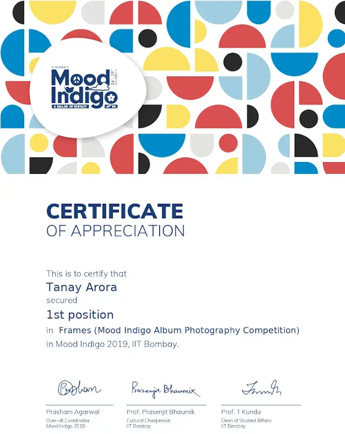 Our student Tanay Arora from User Experience Design (Batch 2017-21) has made us proud at SID with his achievement at the Mood Indigo's Photography competition called Frames.