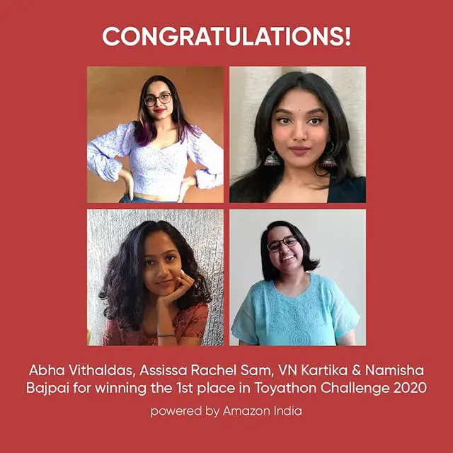 Great Achievement by our 3rd year Product Design students Abha Vithaldas, Assissa Rachel Sam, VN Kartika & Namisha Bajpai for winning the 1st place in the Toyathon Challenge 2020 powered by Amazon India!!!